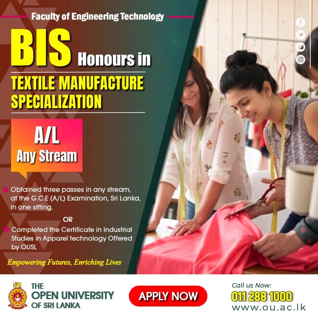 The Faculty of Engineering Technology, The Open University of Sri Lanka (OUSL) is now accepting applications for the Bachelor of Industrial Studies (Honours) – Textile Manufacture Specialization.